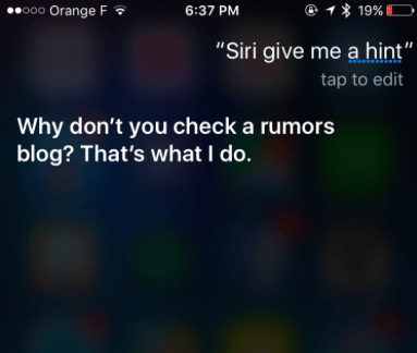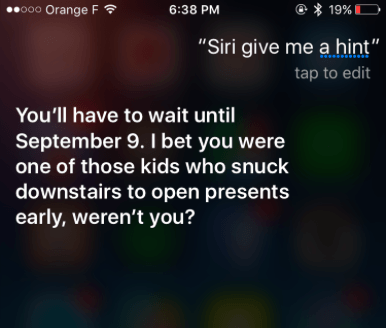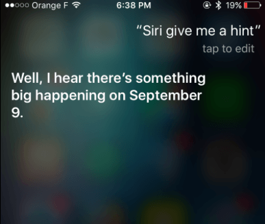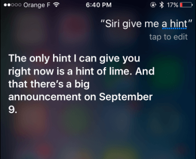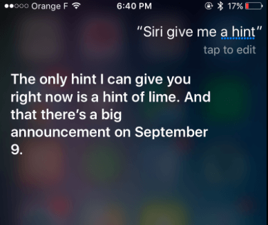Η Apple έχει ήδη στείλει προσκλήσεις σε δημοσιογράφους για το event που θα γίνει στις 9 του Σεπτέμβρη! Οι προσκλήσεις ξεκινούν με την εξής φράση: “hey Siri, give us a hint.”  και η Siri έχει προγραμματιστεί να δίνει διαφορετικά hints. Κανένα απο αυτα δεν είναι ιδιαίτερα αποκαλυπτικό, αλλά για ακόμη μια φορά η Apple μας δείχνει πόσο καλή σχέση  έχει με το marketing.Παρακάτω μπορείτε να δείτε μερικές απο τις απαντήσεις που δίνει. Εσείς ρωτήσατε την Siri;